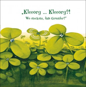 „Unser Butzerl hat vier Bladln“, jubelt hingegen die bayerische Kleeblatt-Mutter Kleeronika über ihren Nachwuchs. Und der Kleernstl, der glückliche Kindsvater, meint: „Vierbladrige bringan a Glick.“ Auf der fränkischen Wiese glaubt freilich der „Gleeggehard, der wamberde, alde Brodzler“, nicht an die glücksbringende Wirkung des seltenen vierten Blatts: „Ob drei odda väia Bläddla is worschd.“ Die Wiesenbewohner aber wissen: Das Glück ist ein Rindviech. Und es naht sich umgehend in Gestalt einer hungrigen Kuh…