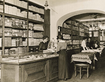 Verkaufsraum des Wäschehauses „Rosner & Seidl“ mit Mitarbeiterinnen und Kundschaft, ca. 1910