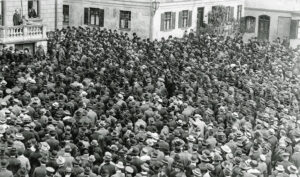 Sonntag, 18. Mai 1919: Der Bürgermeister der Stadt Freising, Stephan Bierner, steht auf der Terrasse des Laubenbräus und spricht sich gegen den Entwurf des Versailler Friedensvertrags aus. Auf dem Freisinger Marienplatz vor ihm haben sich, wie es scheint, alle Bürger und vereinzelt auch Bürgerinnen der Stadt zur Protestversammlung zusammengefunden. Die Empörung ist greifbar, es gilt, seinen Unmut gegen den drohenden „Gewaltfrieden“ kundzutun, denn dieser beinhaltet nicht nur erhebliche Gebietsabtretungen Deutschlands, sondern auch hohe Reparationsforderungen und die Zuweisung der alleinigen Kriegsschuld an das geschlagene Deutschland. Der Fotograf Josef Hofmann hält den Protest in Freising für das Freisinger Tagblatt fest.