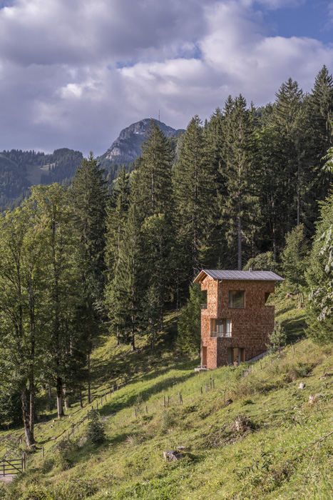 zu dem für die Region Miesbach typischen Bautypus, dem Einfirsthof mit flach geneigtem Satteldach, haben sich in den letzten Jahren Baustile gesellt, die traditionelle Bauweisen modern interpretieren. Ein Beispiel dafür sind die „Lufthütten“ in Bayrischzell. Die Häuschen stehen abseits vom Hauptgebäude, dem Naturhotel Tannerhof, auf einem Berghang und sind so schlicht gehalten, dass sie sich nahtlos zwischen Wald und Wiese in die Landschaft integrieren. Mit den ausgeschnittenen Aufgängen und Balkonen bieten sie die Möglichkeit, die Jahreszeiten, Licht, Luft und Wasser auf besondere Weise zu entdecken und zu erleben. Ihr plastisches Volumen und die helle, vollflächige Schindelverkleidung stehen im offenen Dialog zu den urigen „Lufthütten“ von früher, die mit der dunklen Außenverkleidung und der gewaltigen Vordachtiefe das ideale Pendant liefern.