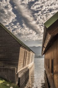 Stein und Holz – Material, das es immer schon vor Ort gab – wurden auch beim Bau der neuen Schiffswerft am Tegernsee verwendet. Insbesondere Holz ist konstruktives Element und – auch in der Bekleidung der Außenhaut – der prägende Werkstoff des Gebäudes. Wie selbstverständlich tragen die naturbelassene Konstruktion und die Baustoffe in ihrer materialgerechten Verwendung zur Erscheinungsform bei. Dabei ist der Neubau, eingeschoben zwischen den beiden bestehenden Bootshäusern, keineswegs ein Fremdkörper, sondern sorgt zusammen mit der einheitlichen Dachgestaltung aus grün beschichteten Blechbahnen für ein stimmiges Ganzes.