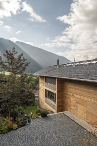 Beim Vorbeigehen präsentiert sich das Wochenendrefugium eines Münchner Paares als gewöhnliches Wohnhaus, das sich perfekt in die steile Topografie einfügt. Erst bei genauem Betrachten wird das lang gezogene Volumen sichtbar, das in seiner Einfachheit an ländliche Lagerstätten erinnert. Der warme Rotton der umgreifenden Lärchenholzfassade und die Hanglage minimieren den Baukörper. Die, über die gesamte Südseite gehende, zurückgesetzte Glasfassade lässt Licht und Bergkulisse ungehindert in den Raum dringen, schützt aber dennoch vor neugierigen Blicken. Naturstein prägt Küchenarbeitsplatte, Esstisch und alle Bäder. All das macht den Neubau zu einem Bauwerk, das sich zur Gegenwart bekennt und dabei zweifelsohne neben Bauten besteht, die bereits dreihundert Jahre alt sind.