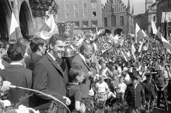 Wenn die Stadt München zum Tag der offenen Tür lädt, wollen viele Rathaus-Besucher natürlich zum berühmtesten Balkon der Stadt. Einmal da oben stehen, wo sich die Bayern feiern lassen! 1974 kamen die Fans den Stars um Franz Beckenbauer und Sepp Maier sogar noch näher: Die Mannschaft stand auf einem blumengeschmückten Podium vor dem Rathaus und reckte,umgeben von 30.000 begeisterten Menschen, den Europapokal der Landesmeister und die Meisterschale in die Höhe. Der Europapokal war der bis dato größte Triumph in der Vereinsgeschichte. Ein Jahr später, als der Europapokal der Landesmeister erneut an den FC Bayern ging, grüßte Franz Beckenbauer schon vom Balkon herunter.
