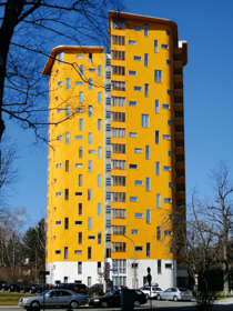 als Berlin 1945 von den Alliierten besetzt und in vier Sektoren aufgeteilt wurde, verlagerte die dort seit fast 100 Jahren ansässige Firma Siemens große Bereiche des Unternehmens nach München. Siemens beauftragte damals Emil Freymuth, eine Siedlung im Münchner Stadtteil Obersendling mit 528 Arbeiterwohnungen zu planen. Mit den beiden 17-geschossigen, die Reihenhäuser der Anlage überragenden Hochhäusern auf sternförmigem Grundriss, erschuf Freymuth die erste Hochhaus-Wohnsiedlung in Süddeutschland. Von ihrer Architektur über die Ausstattung der Einzelwohnungen bis hin zu ihrer Konzeption als Parkstadt galt die Anlage als sehr modern. Ein geplantes drittes Hochhaus konnte jedoch aus Kostengründen nicht realisiert werden.