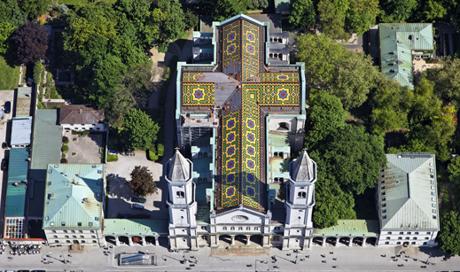 Von der Feldarbeit in die Großstadt München, wo die Ludwigskirche mit ihrem bunten Dach ins Auge sticht. König Ludwig I. ließ das Gotteshaus einst als Bestandteil seiner Prachtstraße nach Norden, der Ludwigsstraße, von Friedrich von Gärtner errichten. Im 2. Weltkrieg wurde die Kirche schwer beschädigt, jedoch nach und nach wiederaufgebaut. Zuletzt entschied man sich, auch das Dach wieder nach den Originalentwürfen Gärtners einzudecken. 2007 bis 2009 erfolgten die Arbeiten – wie im Bild zu sehen.