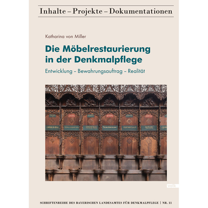 In ihrem Buch „Die Möbelrestaurierung in der Denkmalpflege. Entwicklung – Bewahrung – Realität“, das 11. Band der Schriftenreihe des Bayerischen Landesamtes für Denkmalpflege erschienen ist, schlüsselt Katharina von Miller „systematisch die relevante Archivalienlage von dreißig Fallbeispielen auf und stellt ihr konsequent das heutige Erscheinungsbild der jeweiligen Ausstattung inclusive naturwissenschaftlicher Untersuchungen gegenüber“ – das das Urteil von Gerdi Maierbacher-Legl in den „Denkmalpflege Informationen“ (Nr. 163/März 2016). Fazit: „So wird dieser Band der Schriftenreihe des BLfD insgesamt zum Nachschlage- und Lehrbuch für die Vorlaufgeschichte einer jungen Disziplin der Restaurierung, das dieser bei der Positionierung im interdisziplinären Zusammenspiel aller an der Erhaltung von Kunst und Kulturgut Beteiligten wertvolle Hilfestellung leisten wird.“